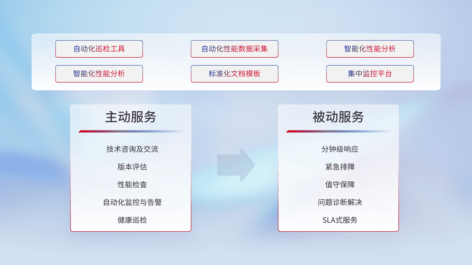 智能化工具和标准化文档,,,保障服务质量,,,,提供主动服务(包含技术咨询、、版本评估、、、、性能检查、、、、自动化监控与告警、、、、健康巡检)和被动服务包含(分钟级响应、、、紧急排障、、值守保障、、问题诊断解决、、、SLA服务)。。。